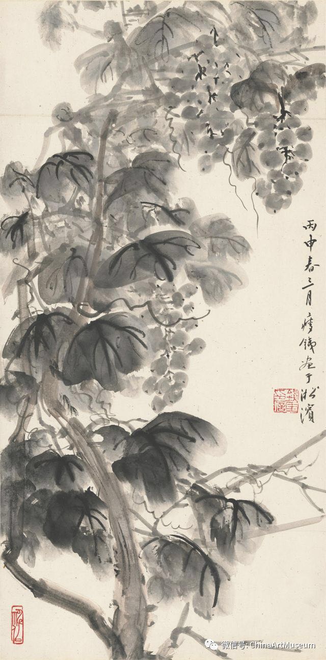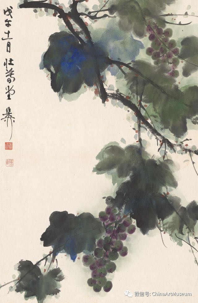 擅长画葡萄的画家有很多,水墨葡萄,随意涂抹点染,即可见葡萄倒挂枝头,形象生动;利用墨色的浓淡和中间留出的高光,亦能画出晶莹剔透的葡萄。