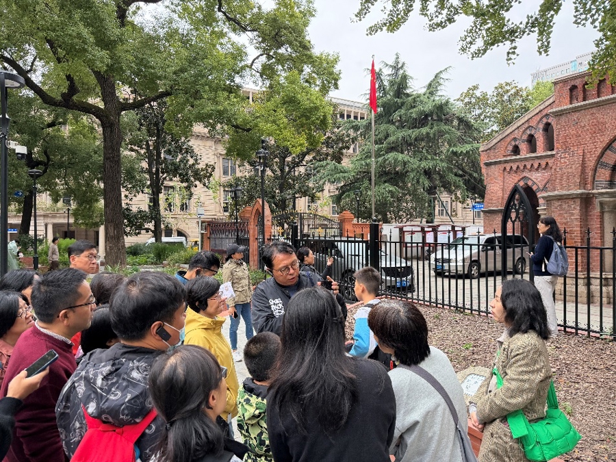 行至福州路出版街区与过去所称的棋盘街,时光仿佛回溯到百年前的文化盛景。在汪涤的生动讲述中,商务印书馆、中华书局的思想启蒙浪潮与岭南画派的革新呐喊交织回响。这里不仅是“出版王国”的核心,更是美术革命的策源地——岭南画派创始人“二高一陈”在此创办《真相画报》,同时以审美书馆为据点,用画笔打破传统桎梏,让“美术革命”的火种在上海落地生根,在与海派的同行交流中熠熠展翅。随后,队伍途经麦家圈仁济医院西院,这座中国最早的西医院之一,见证了中西医学的交融,也承载着广东籍侨民“仁心济世”的公益精神。